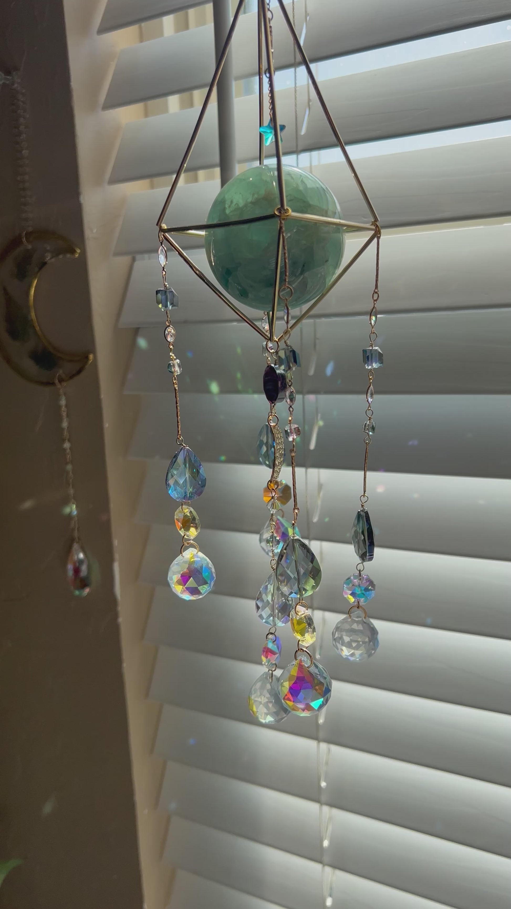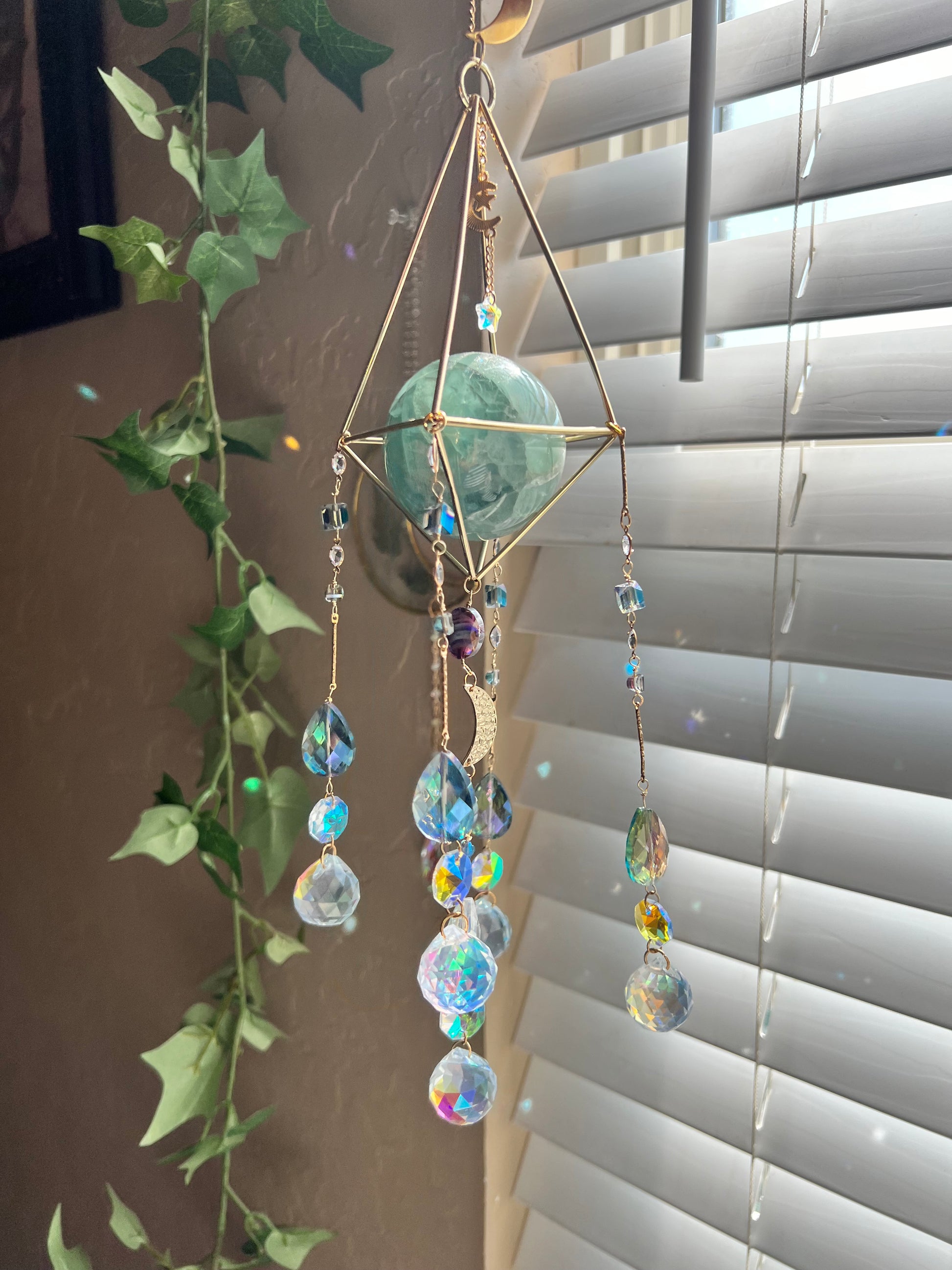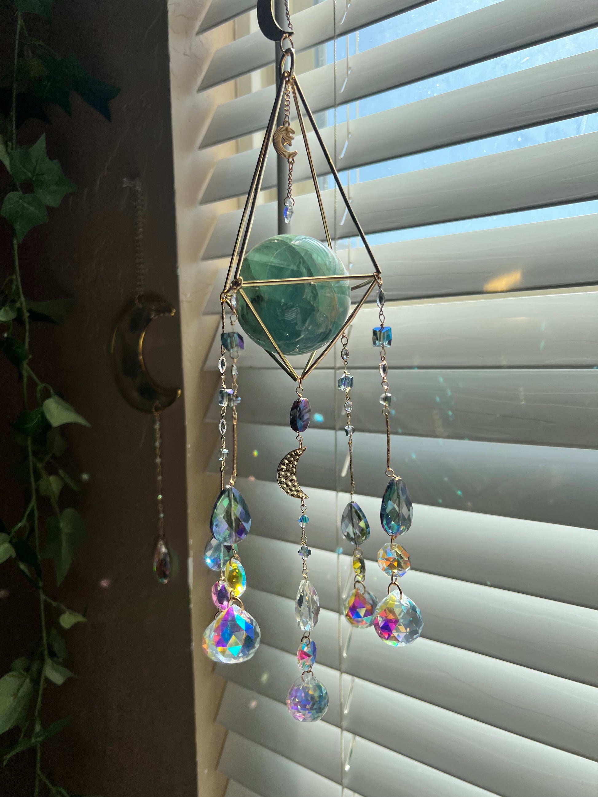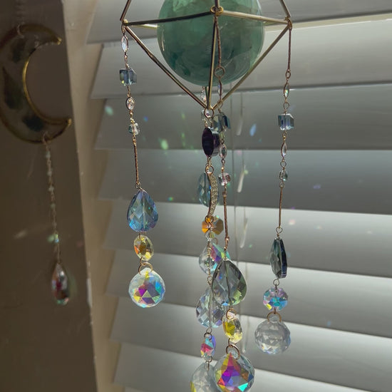 This suncatcher offers a unique glimpse into a moonlit forest (ok, not really). Featuring a green genuine flourite sphere, an abundant array of purple and green crystals, this collection is the perfect option for those wanting to capture the beauty of the natural world.